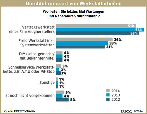 In Zusammenarbeit mit der Kraftfahrzeugüberwachungsorganisation freiberuflicher Kfz-Sachverständiger e.V. (KÜS) erhebt die Zeitschrift Kfz-Betrieb regelmäßig ihren sogenannten „Trend-Tacho“ zu verschiedenen Branchenthemen. Zuletzt wurden in diesem Rahmen die ABH Market Research GmbH und die BBE Automotive GmbH mit der Befragung von 1.000 Autofahrern hinsichtlich ihrer Werkstattwahl beauftragt. Gezeigt hat sich dabei – analog zu den jüngsten Ergebnissen des „Werkstattmonitors 2014“ vom TÜV Rheinland – einmal mehr eine hohe Kundenloyalität, wenn es um die Frage geht, welche Werkstatt für Arbeiten am eigenen Fahrzeug angesteuert wird. Denn lediglich elf Prozent der Befragten sollen angegeben haben, während der vergangenen 24 Monate ihre Werkstatt gewechselt zu haben. Mit 89 Prozent ist damit der Anteil derjenigen, die nicht wechseln, in etwa genauso hoch wie 2013 (91 Prozent) und 2012 (90 Prozent). Wenn doch gewechselt wurde, dann wurden als Hauptgründe dafür ein neues Auto (36 Prozent), zu hohe Werkstattpreise (15 Prozent) und inkompetente Beratung (13 Prozent) angegeben gefolgt von zahlreichen weiteren – augenscheinlich weniger wichtigen – Erklärungen (Umzug, schlechte Durchführung der Arbeiten, ungünstige Lage des Betriebes etc.).