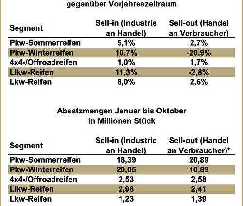 Angesichts eines bisher doch recht schleppenden Wintergeschäftes sprechen altgediente Reifenhändler mit Blick auch noch auf die ersten November-Wochen zwar schon mal von einem „noch nie da gewesenen Einbruch“, den man „bis dato gar nicht für möglich gehalten“ habe. Doch auf der anderen Seite zeigt sich die Reifenindustrie demgegenüber vergleichsweise unbeeindruckt vom vor allem bedingt dadurch bis Ende Oktober aufgelaufenen Absatzminus bei Pkw-Reifen im deutschen Reifenersatzmarkt, was die Verläufe des Handels in Richtung Verbraucher (Sell-out) angeht. Noch muss man da wohl sagen.