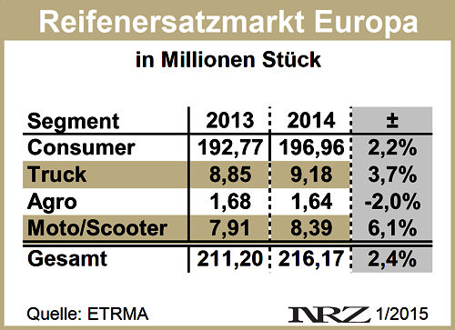 Mit Blick auf das abgelaufene Jahr bilanziert die European Tyre and Rubber Manufacturers’ Association (ETRMA) ein 2014 „positiv stabiles” Reifenersatzgeschäft in Europa. Gemeint damit ist, dass mit Ausnahme der Produktgruppe Landwirtschaftsreifen, von denen die Mitglieder des europäischen Reifen- und Kautschukverbandes mit gut 1,6 Millionen Stück zwei Prozent weniger an ihre Handelspartner ausliefern konnten als das Jahr zuvor, in allen anderen Teilsegmenten mehr oder weniger große Zuwächse beim Absatz Industrie an Handel (Sell-in) registriert wurden. Am deutlichsten legte dabei der Absatz an Motorrad-/Rollerreifen zu: Er wuchs um über sechs Prozent auf europaweit knapp 8,4 Millionen Einheiten.