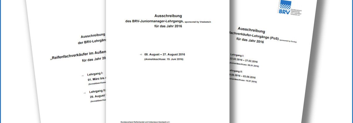 - BRV-Reifenfachverkäufer „Point of Sale“; Termin I: 22. bis 27. Februar 2016; Termin II: 29. August bis 3. September 2016; die Ausschreibung finden Sie direkt hier;
