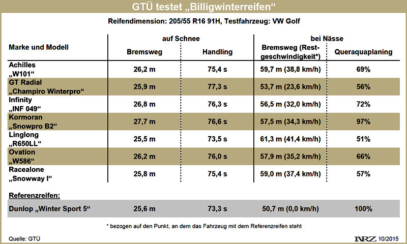 Als Referenz diente Dunlops „Winter Sport 5“, während als Produkte „aus der unteren Preisklasse“ die Profile, Achilles „W101“, GT Radial „Champiro Winterpro“, Infinity „INF 049“, Kormoran „Snowpro B2“, Linglong „R650LL“, Ovation „W586“ und Racealone „Snoway I“ ihr Können hinsichtlich Bremsweg, Nässe- und Handlingeigenschaften beweisen mussten. Insgesamt sollen die „Billigreifen“ dabei Schwächen in allen Disziplinen gezeigt haben, obwohl sie etwa beim Bremstest auf Schnee (50 km/h auf 5 km/h) beim ersten Blick auf die Messwerte – so die GTÜ – gar nicht so schlecht abschneiden. Der Unterschied werde erst beim gesamten Anhalteweg deutlich, heißt es aber ergänzend. „Insgesamt schneiden die ‚Billigreifen’ beim Bremsen auf geschlossener Schneedecke schlechter ab als der Referenzreifen. Die Unterschiede sind zwar nicht sehr groß, aber man muss berücksichtigen, dass der Bremsvorgang nur bei geringer Geschwindigkeit durchgeführt wird“, erklärt der GTÜ-Sachverständige Ludger Monz die mit rund zwei Metern vergleichsweise geringe Differenz zwischen dem besten und dem schlechtesten Reifen in dieser Teildisziplin. Der Gesamtanhalteweg mit dem Schlechtesten soll aber mehr als eine Fahrzeuglänge mehr betragen haben als mit dem Referenzreifen.