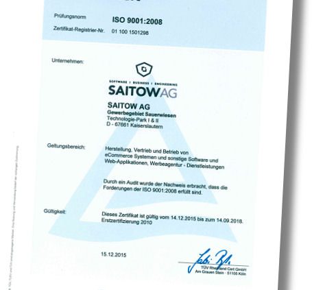 Der TÜV Rheinland hat das Qualitätsmanagementsystem der Saitow AG gemäß ISO 9001:2008 für den Geltungsbereich „Herstellung, Vertrieb und Betrieb von E-Commerce-Systemen und sonstiger Software und Webapplikationen, Werbeagenturdienstleistungen” zertifiziert. Genauer gesagt hat es sich dabei vielmehr um ein Reaudit gehandelt, zumal das ehemals als Tyre24 GmbH firmierende Unternehmen aus Kaiserslautern auch vorher bereits bzw. seit 2010 eine entsprechende Zertifizierung vorweisen konnte. Damit werde der Saitow AG bescheinigt, dass dort auch weiterhin alle Prozesse festgelegten Qualitätsnormen entsprechen und darüber hinaus die Kundenzufriedenheit mithilfe eines fest in die Unternehmensabläufe integrierten Verbesserungsprozesses stetig erhöht wird, heißt es. Ziel des Ganzen sei es, eine gleichbleibend hohe Qualität der Produkte, Prozesse und Dienstleistungen sicherzustellen. „Die erfolgreiche Umsetzung und kontinuierliche Verbesserung unserer Unternehmens- und Qualitätsziele messen wir anhand definierter Prozesskennzahlen”, erklärt Michael Saitow.