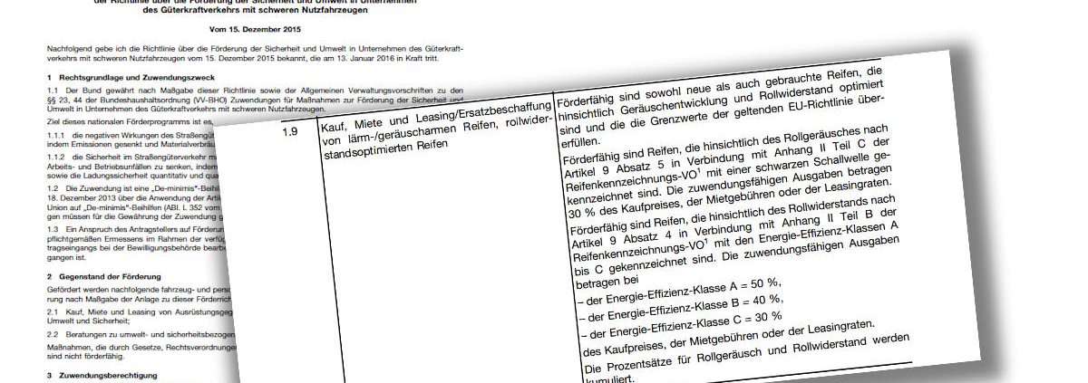 Als die NEUE REIFENZEITUNG vor einer Woche über die neue De-minimis-Förderrichtlinie berichtete („Eine existenzielle Frage“: Neue De-minimis-Förderung ohne Runderneuerte?), war sie noch nicht im Bundesanzeiger veröffentlicht. Dies hatte Hoffnungen im Reifenhandel genährt, man könnte gegebenenfalls doch noch vor Inkrafttreten der neuen Richtlinie formell Einfluss auf die Maßnahme nehmen und sicherstellen, dass auch weiterhin runderneuerte Lkw-Reifen grundsätzlich in den Genuss einer entsprechenden Förderung kommen können. Dem Wortlaut der neuen Richtlinie zufolge schien dies zunächst ausgeschlossen. Mittlerweile ist die Richtlinie allerdings auch im Bundesanzeiger veröffentlicht worden – mit unverändertem Wortlaut, wie Sie hier im PDF nachlesen können. Datum des Inkrafttretens: Mittwoch, 13. Januar 2016. Dennoch kommt wohl Bewegung in die Angelegenheit.