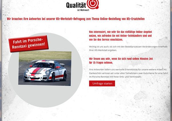 Zum Jahresanfang richtet sich die Initiative „Qualität ist Mehrwert“ mit einer Onlineumfrage an Kfz-Werkstätten, bei der es um die Bestellung von Ersatzteilen via Internet geht. „Das Thema der Onlinebestellung von Kfz-Ersatzteilen nimmt an Relevanz zu. Für uns als Initiative ist es deshalb wichtig zu erfahren, wie Kfz-Werkstätten das Thema sehen, welche Teile sie im Internet bestellen, aber auch, welche Kfz-Teile sie niemals im Internet bestellen würden. Die Frage, mit welchen Internetportalen gute oder schlechte Erfahrungen gemacht wurden, ist von zentraler Bedeutung“, so Josef Frank, Pressesprecher der Initiative. Bei den 15 Fragen, für deren Beantwortung etwa sieben Minuten Zeit veranschlagt werden, geht es dabei unter anderem auch darum, ob sich im Zuge geänderter Bestellprozesse Veränderungen innerhalb der Betriebe ergeben haben. Die Teilnehmer an der dieser Tage gestarteten und zehn Wochen lang laufenden Befragung unter http://qualitaet-ist-mehrwert.de/umfrage haben übrigens die Chance, eine von insgesamt zwei Fahrten in einem Porsche-Renntaxi zu gewinnen. Im April soll die Auswertung der Ergebnisse erfolgen, von denen sich die Initiative „wertvolle Erkenntnisse für ihre weitere Arbeit“ erhofft. cm