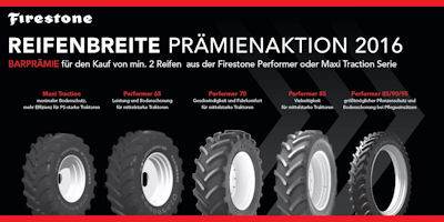 Firestone hat jetzt seine Prämienaktion „Reifenbreite“ für Landwirtschaftsreifen gestartet. In den kommenden drei Monaten bis zum 31. Mai können sich Käufer von mindestens zwei Reifen aus Firestones Performer- oder Maxi-Traction-Reihe eine Barprämie von bis zu 200 Euro je Achse sichern. Die Höhe der Gutschrift ist dabei abhängig von der Breite der gekauften Reifen: Bei einer Breite von 230 bis 340 Millimeter können 100 Euro je Achse gutgeschrieben werden, bei 440 bis 900 Millimeter 200 Euro und dazwischen 150 Euro. Alle Details und Teilnahmebedingungen zu der Aktion sind unter www.firestone-reifenbreite.eu zusammengefasst. ab