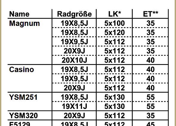 Das Kraftfahrtbundesamt (KBA) warnt vor Sonderrädern, die über die Firmen TT Concepts e.K. (Rheine) oder Giovanna Design (Rheine) vertrieben wurden. Aufgrund unzureichender Festigkeit bestehe bei ihnen Gefahr, dass sie während Fahrt brechen könnten, heißt es. Betroffen sind demnach Rädermodelle, die unter den Namen „Magnum“, „Casino“, „YSM251“, „YSM320“ und „F5129“ in den Markt gelangt sind – um genau welche Größenausführungen es sich dabei handelt, lässt sich nebenstehender Tabelle entnehmen. Mit seiner Warnung richtet sich das KBA an Kfz-Werkstätten, den Kfz-Teilehandel und Privatkunden, die Sonderräder von den Firmen TT Concepts e.K. oder Giovanna Design erworben haben. „Die Eintrittswahrscheinlichkeit eines Radbruchs steigt mit der Nutzungsdauer. Deshalb empfiehlt das KBA, ein Fahrzeug, an dem oben genannte. Sonderräder montiert sind, nicht weiter zu nutzen“, so die Behörde. Wer Räder des fraglichen Typs in seinem Besitz hat, sollte sich demnach direkt an die produktverantwortliche Firma TT Concepts e.K., Inhaber Anatolij Obert, Drenthestraße 1, 48429 Rheine, wenden. cm