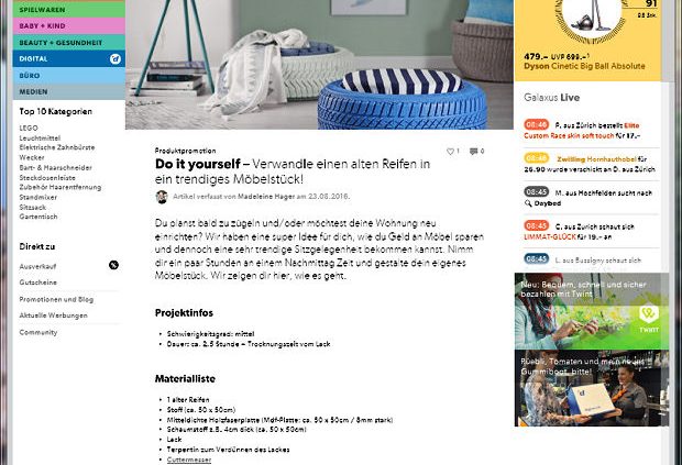 Der Schweizer Onlineshop Galaxus der Züricher Digitec Galaxus AG zeigt auf einer Projektseite wie man im Do-it-yourself- bzw. DIY-Verfahren einen ausgedienten Pkw-Reifen zu einem Möbelstück umarbeiten kann. Da es einem Webshop vordergründig natürlich ums Verkaufen von Produkten geht, sind einige der dafür eingesetzten Werkzeuge und Hilfsmittel direkt auf der Site bestellbar – sofern ein ambitionierter Heimwerker sie nicht ohnehin schon im Hause hat. Jedenfalls wird das ausgediente Gummi durch Zuhilfenahme unter anderem einer Farbsprühpistole, Holzfaserplatte und Stichsäge sowie eines Cuttermessers, Schaumstoff und noch weiteren Materialien mehr letztlich zu einem „Wohnzimmersessel“ umfunktioniert. cm