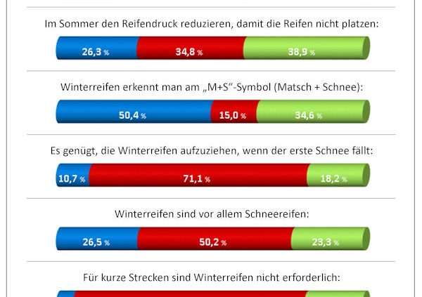 Und das kam raus: 26 Prozent der Autofahrer halten es im Sommer für angebracht, den Reifendruck zu reduzieren, da sich Luft bei hohen Temperaturen viel stärker ausdehnt und der Reifen sonst platzen könnte, hätten die Fahrer angegeben heißt es in einer Mitteilung von Reifen.com. Für jeden elften Autofahrer seien Beulen und Risse Gebrauchsspuren, die die Verwendungsfähigkeit von Reifen nicht infrage stelle. Nur 65 Prozent würden solche Schäden zum Anlass nehmen, um die Reifen zu wechseln. Weiter heißt es: Fast jeder fünfte Autofahrer (18 Prozent) ist davon überzeugt, dass er der Winterreifenpflicht nachkommt, wenn er nur ein einzelnes Paar Winterräder an einer der Achsen montiert.