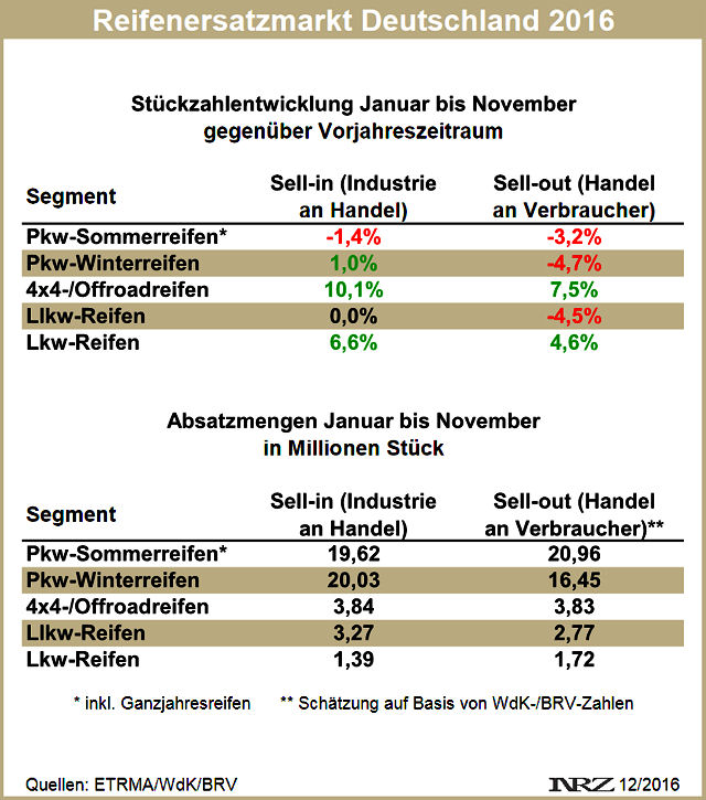 Schon nach dem September bzw. Oktober hatte sich nach abgezeichnet, dass der Stückzahlabsatz an Pkw-Reifen im deutschen Reifenersatzgeschäft wohl auch 2016 einmal mehr hinter dem des Vorjahres zurückbleiben würde. Schließlich ruhten nach einem mehr oder weniger enttäuschenden Sommerreifengeschäft die Hoffnungen der Branche wieder auf der Wintersaison, die in den beiden besagten Monaten allerdings recht schwach gestartet war mit Absatzrückgängen, die gemäß des sogenannten Sell-out-Panels vom Wirtschaftsverband der deutschen Kautschukindustrie (WdK) bei gut 20 Prozent (September) respektive rund 15 Prozent (Oktober) lagen. Im November lagen die Verkäufe an Pkw-Winterreifen des Handels in Richtung Verbraucher der WdK-Statistik zufolge dann zwar um etwa 15 Prozent über denen desselben Monats 2015, aber kumuliert steht in diesem Segment immer noch ein Minus von runden vier Prozent unterm Strich nach elf Monaten. Selbst wenn es bei alldem zu bedenken gilt, dass die WdK-Zahlen nur einen kleineren Teil des Gesamtmarktes widerspiegeln und dabei zudem schwerpunktmäßig Betriebe des Vertriebskanals Reifenfachhandel abbilden, ist der Trend doch eher leicht negativ bzw. bestenfalls stabil gegenüber dem in der Stückzahlbilanz schon enttäuschenden Jahr 2015. Dies spiegelt sich genauso in der vorläufigen Bilanz des Bundesverbandes Reifenhandel und Vulkaniseurhandwerk e.V. (BRV) zum sich dem Ende zuneigenden Jahr wider.