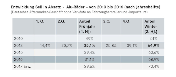 Ein Blick auf die Absatzzahlen von Alurädern im Jahresverlauf zeigt, dass sich – dem Trend der letzten Jahre folgend – das Umrüstgeschäft mehr und mehr auf die Wintersaison konzentriert. Entfielen in 2013 noch gut 35 Prozent des Absatzes auf das 1. Halbjahr, so rechnen die Panelteilnehmer für 2017 mit einem Rückgang des Frühjahrsgeschäftes auf knapp unter 30 Prozent. Mit Sorge beobachten sie deshalb den Trend zur steigenden Nachfrage nach Ganzjahresreifen und rechnen im Schnitt damit, dass dieser im Wintergeschäft 2017/2018 zu einem Rückgang des Gesamtvolumens an Rädern im Ersatzmarkt um etwa fünf Prozent führen wird. cs