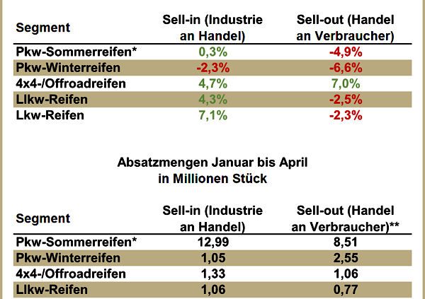Was die Nachfrage nach neuen Pkw in Deutschland betrifft, ist die im April zwar rückläufig gewesen gegenüber demselben Monat. Doch insgesamt liegen die Zulassungszahlen im bisherigen Jahresverlauf immer noch im Plus. Dass ein einzelner Monat aber durchaus auch einen deutlich größeren Unterschied machen kann, zeigt parallel dazu ein Blick auf die Absatzentwicklung im Reifengeschäft Handel an Verbraucher (Sell-out). Bis einschließlich März lag die Zahl der an die Frau oder den Mann gebrachten Pkw-Reifen laut dem sogenannten Sell-out-Panel des Wirtschaftsverbandes der deutschen Kautschukindustrie (WdK) Monat für Monat jeweils über Vorjahr, sodass mit Stand zum Ende des ersten Quartals ein ansehnliches Plus von ziemlich genau zwischen zwölf und 13 Prozent unterm Strich stand.