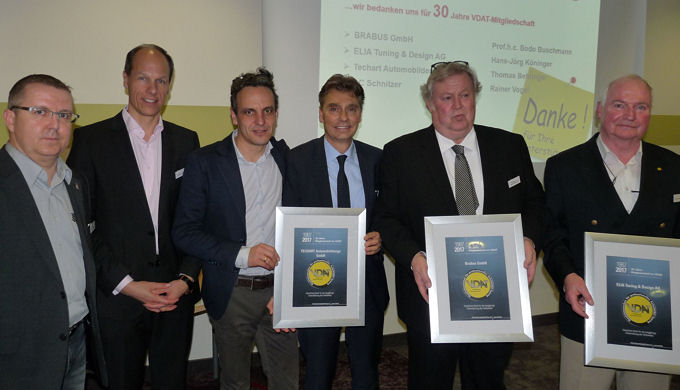 Nicht nur der Verband der Automobiltuner e.V. (VDAT) selbst kann in diesem Jahr auf sein 30-jähriges Bestehen zurückblicken, sondern auch vier seiner Mitglieder. Die Firmen AC-Schnitzer, Brabus GmbH, Elia Tuning & Design AG und Techart Automobildesign GmbH engagieren sich seit Gründung im VDAT. Anlässlich des Jubiläums wurden den Firmenchefs Rainer Vogel, Prof. h.c. Bodo Buschmann und Thomas Behringer sowie dem Elia-Aufsichtsratsmitglied Hans-Jörg Köninger jeweils eine Urkunde und ein „edler Tropfen“ übergeben. Darüber hinaus konnte sich der VDAT-Vorstand aber bei noch weiteren Unternehmen für eine langjährige Mitgliedschaft bedanken: 20 Jahre dabei sind die Foliatec Böhm GmbH & Co KG, Messe Essen GmbH, Vogtland Autosport GmbH und ZF Race Engineering GmbH, während sich die Alcar Deutschland GmbH, DTE Systems GmbH, JMS Fahrzeugteile GmbH und Stoffler Autotechnik GmbH mittlerweile bereits zehn Jahre Mitglied im VDAT sind. „Nur ein starker Berufsverband kann die Interessen seiner Mitglieder und der Branche erfolgreich gegenüber der nationalen und europäischen Politik vertreten“, dankt die Interessenvertretung der Tuningbranche auch allen anderen Mitgliedern. cm