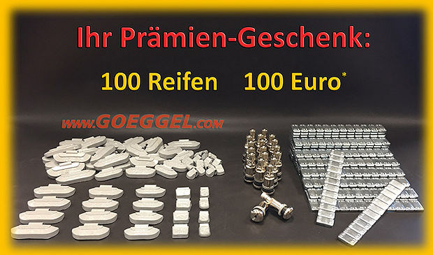 Im Vorfeld der Wintersaison hat Reifen Göggel wieder eine Bonusaktion für seine Kunden gestartet. Wer sich im September bei dem Großhändler bevorratet, soll beim Bestellen von in Summe 100 Reifen im betreffenden Monat über den Onlineshop des Unternehmens unter www.goeggel.com als einmalige Zugabe in den Genuss von Montagematerial im Wert von 100 Euro kommen. Das Set umfasst demnach Schlaggewichte für Stahlfelgen (fünf bis 30 Gramm, je eine Packung), Klebegewichte (eine Packung à 100 Stück in Fünf-Gramm-Teilung), Stahlventile (20 Stück) sowie Klebegewichtentferner. Neukunden, die bis zum 30. September vier Pkw-Reifen, vier Felgen oder vier Kompletträder in dem Göggel-Shop kaufen, wird zudem ein Willkommensbonus in Höhe von zehn Euro gezahlt. cm