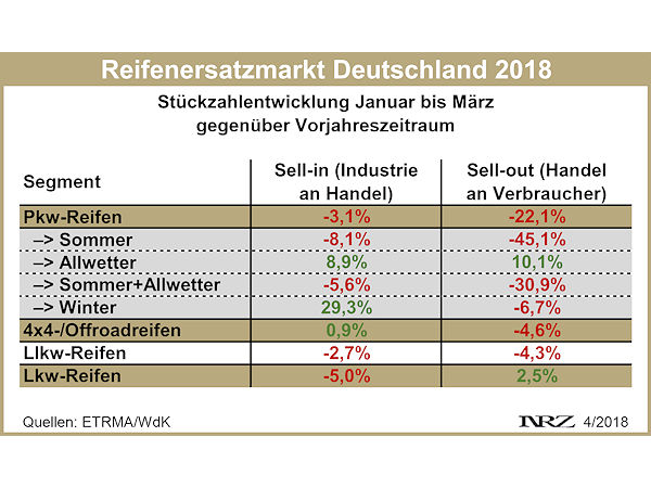 Die ersten Monate des Jahres sind zwar schon seit je her ruhig gewesen, was das Reifenersatzgeschäft hierzulande betrifft. Doch mit Blick auf den diesjährigen Januar bis März trifft die von einem Händler im Gespräch mit der NEUE REIFENZEITUNG gewählte Beschreibung als „überdurchschnittlich ruhig“ die Situation wohl doch recht treffend. Zumindest legt das ein Blick auf die Entwicklung der Absatzzahlen sowohl im Sell-out (Handel an Verbraucher) als auch im Sell-in (Industrie an Handel) verglichen mit demselben Zeitraum 2017 nahe. Selbst wenn es basierend darauf für weitergehende Prognosen das Gesamtjahr betreffend noch deutlich zu früh sein mag: Obwohl für 2018 mit Ausnahme der Nachfrage bei Ganzjahresreifen ohnehin eher Stagnation erwartet wird, hätte sich die Branche letztlich wohl doch ein bisschen mehr erhofft als das während der ersten drei Monate Beobachtete. christian.marx@reifenpresse.de