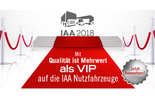 Die IAA Nutzfahrzeuge wirft ihre Schatten voraus. Die Leitmesse für Transport, Logistik und Mobilität öffnet vom 20. bis 27. September ihre Pforten. Die Initiative „Qualität ist Mehrwert“ eröffnet ausgewählten Nfz-Werkstätten nun die Möglichkeit, einen exklusiven Blick hinter die Kulissen zu werfen. Nur vier Werkstatt-Mitarbeiter werden ausgewählt, die diesen besonderen Tag erleben dürfen, heißt es in einer Mitteilung. Das erwartet die Auserwählten: Kostenloses Tagesticket, Besichtigung Knorr-Stand, Führung über den Stand von Continental und „unvergessliches Virtual-Reality-Erlebnis. Zudem gibt es eine Führung über den Bosch-Stand und dann erstmal eine Kaffeepause. Bewerbungsschluss ist der 16. September 2018. cs