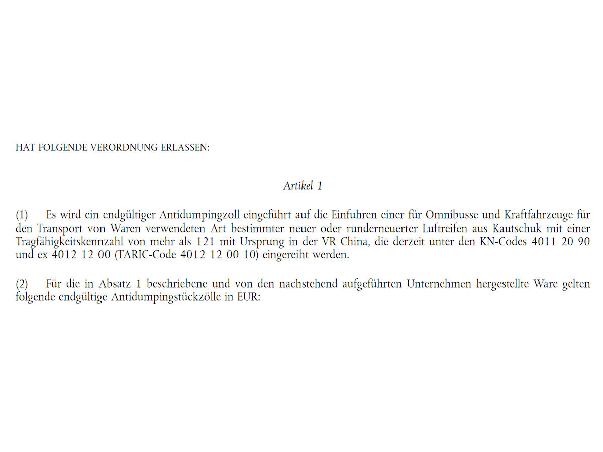 Die Entscheidung ist gefallen: Die EU erhebt wie geplant feste Antidumpingzölle auf neue und runderneuerte Lkw- und Busreifen aus China. Wie die EU-Kommission heute im Amtsblatt der Europäischen Union schreibt, gelte die Verordnung ab morgen verbindlich, unmittelbar und – wie der BRV in einem aktuellen Statement ergänzt (siehe unten) – auf fünf Jahre befristet in jedem EU-Mitgliedsstaat.