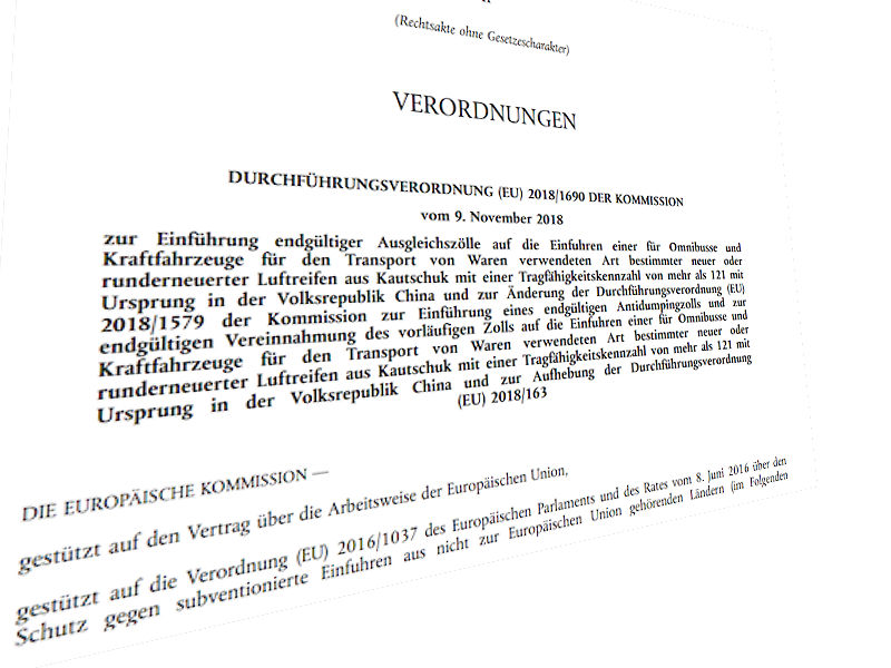 Nachdem die EU-Kommission bereits am 22. Oktober 2018 die Festsetzung der definitiven Antidumpingzölle auf chinesische Lkw-Reifen bekannt gegeben hat, hat die Behörde nun auch offiziell die Antisubventionszölle veröffentlicht. Wie bereits kommuniziert wird die Aufteilung der verhängten Einfuhrzölle auf den Dumping- und Subventionsanteil keinen Einfluss auf die Gesamthöhe der Zölle haben, es bleibt also nach wie vor bei den am 22. Oktober 2018 festgesetzten Antidumpingzöllen und deren Höhe. Trotzdem sei die entsprechende Aufteilung wichtig, da der Subventionsanteil an den Zöllen „im Zweifelsfalle als politisch ‚nachhaltiger‘ eingeschätzt wird“, heißt es dazu vonseiten des Bundesverbands Reifenhandel und Vulkaniseur-Handwerk (BRV).