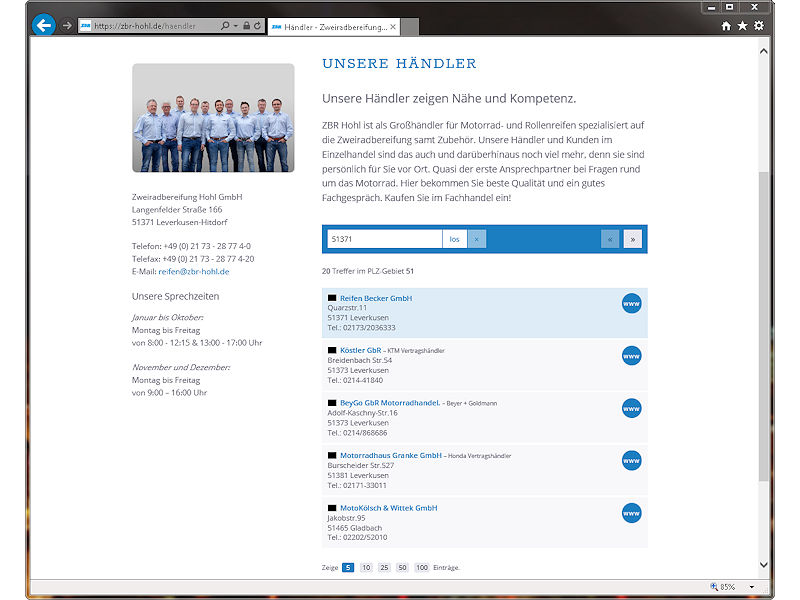 Als auf Motorrad- und Rollerreifen spezialisierter Großhändler konzentriert sich die Zweiradbereifung (ZBR) Hohl GmbH aus Leverkusen-Hitdorf voll und ganz auf Geschäftskunden. Für die Saison 2019 sieht man sich demnach bestens aufgestellt, wobei als Ziel letztlich eine partnerschaftlichen Unterstützung des Motorrad- und Reifenfachhandels verfolgt werde, wie man selbst sagt. Gerade im stressigen Saisongeschäft wolle man gemeinsam mit den Kunden dafür sorgen, dass Motorrad-/Rollerfahrer jederzeit mobil bleiben und auf „bestmögliche Sicherheit durch High-Performance-Produkte“ zurückgreifen können. Nicht zuletzt aus diesem Grund wird Verbrauchern auf der eigenen Website unter www.zbr-hohl.de eine Händlerdatenbank angeboten: Darüber können Biker mittels einer Orts- oder Postleitzahlensuche den ihnen nächstgelegenen Ansprechpartner bei Fragen rund um das Motorrad finden. christian.marx@reifenpresse.de
