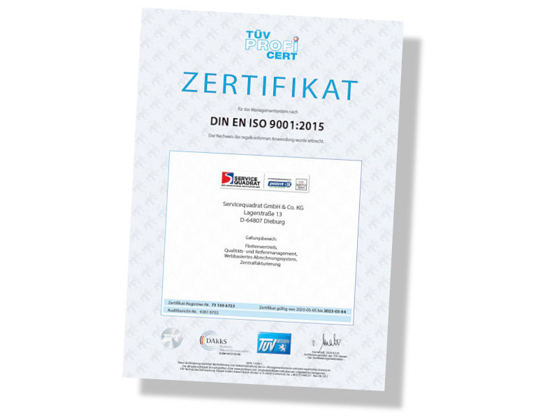 Die Servicequadrat GmbH & Co. KG (Dieburg) stellt seit vielen Jahren ihre Qualität immer wieder auf den Prüfstand des TÜV Hessen. Die Organisation hat der gemeinsamen Tochtergesellschaft der beiden Reifenhandelsverbünde Point S und Top Service Team demnach auch für 2020 die Zertifizierung gemäß DIN EN ISO 9001:2015 bestätigt, die Unternehmen zu einer Steigerung ihrer Leistungsfähigkeit und Erhöhung der Kundenzufriedenheit verpflichte. Auditiert wurden Servicequadrat zufolge die Bereiche Flottenvertrieb, Qualitäts-und Reifenmanagement, das webbasierte Abrechnungssystem sowie die Zentralfakturierung. „Das Siegel zeigt erneut, dass wir uns bei den rechtlichen, technischen und organisatorischen Anforderungen für den Bereich des Reifen- und Autoservice kontinuierlich verbessert haben. Gleichzeitig sichert es unseren Kunden zu, dass wir in der Zusammenarbeit auf einheitliche Verfahrensweisen zurückgreifen“, sagt Servicequadrat-Geschäftsführer Karl-Heinz Kuhfuss. „Die Ergebnisse des aktuellen Audits zeigen einen klaren Weg der kontinuierlichen Verbesserung aller Prozesse bei uns“, ergänzt er. Das aktuelle Zertifikat ist nun bis März 2023 gültig, muss allerdings jährlich im Rahmen eines Überwachungsaudits bestätigt werden. Auf Basis besagter Norm werden bei Servicequadrat mit seinem Netzwerk von deutschlandweit rund 1.100 Servicestationen auch alle angeschlossenen Betriebe überprüft. Dieses interne Verfahren ist jedoch keine Zertifizierung durch den TÜV und wird auf freiwilliger Basis durchgeführt. cm