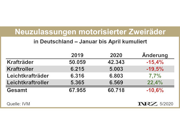 Wie alle anderen Fahrzeugsegmente können sich auch die motorisierten Zweiräder nicht einem Nachfragerückgang aufgrund der Corona-Krise entziehen. Wohl bedingt durch die jüngsten Änderungen bei den Führerscheinbestimmungen stemmt sich die Leichtkraftfraktion gemäß aktueller Zahlen des Industrieverbandes Motorrad e.V. (IVM) allerdings bislang noch gegen den allgemeinen Negativtrend mit einem in den ersten vier Monaten des Jahres aufgelaufenen Plus von knapp acht Prozent auf 6.800 Leichtkrafträder respektive von sogar mehr als 22 Prozent auf annähernd 6.600 Leichtkraftroller. Allerdings kann dies nicht verhindern, dass sich der Gesamtmarkt gegenüber dem entsprechenden Referenzzeitraum 2019 beinahe elf Prozent im Minus präsentiert mit in Summe über alle Maschinengattungen gut 60.700 Einheiten. Zumal allein im volumenmäßig größten Teilsegment der Krafträder die über 43.300 Neufahrzeuge einem Zulassungsrückgang um mehr als 15 Prozent entsprechen. Hinzu kommt dann noch ein Minus von fast einem Fünftel auf 5.000 Kraftroller. christian.marx@reifenpresse.de