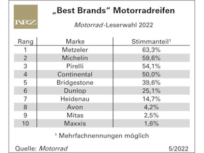 Dass sich Metzeler zum achten Mal in Folge den Titel als „Best Brand“ in Sachen Reifen bei der Leserwahl der Zeitschrift Motorrad hat sichern können vor Michelin und Pirelli hatte wir zwar vor einigen Wochen bereits berichtet. Nicht aber, welche Stimmanteile die Marken auf sich haben vereinigen können, und genauso wenig, wer es auf die Plätze vier bis zehn bei dem Voting geschafft hat. Das wollen wir hiermit nachreichen. Eine Überraschung hat es bei der Reihenfolge des Zieleinlaufes freilich nicht gegeben, ist sie doch die gleiche wie in den Jahren zuvor, selbst wenn die Stimmanteile gegenüber früheren Leserwahlen natürlich leicht variieren. Konkret ist das Spitzentrio laut Motorrad mit 63,3 Prozent (Metzeler), 59,6 Prozent (Michelin) und 54,1 Prozent (Pirelli) aufs Podium gefahren gefolgt von Continental (50,0 Prozent), Bridgestone (39,6 Prozent), Dunlop (25,1 Prozent), Heidenau (14,7 Prozent), Avon (4,2 Prozent), Mitas (2,5 Prozent) sowie Maxxis (1,6 Prozent). christian.marx@reifenpresse.de
