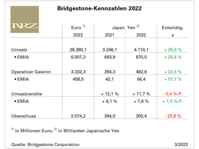 Bridgestone konnte im zurückliegenden Geschäftsjahr sowohl seine Erlöse als auch seine Erträge deutlich steigern. So legte der japanische Hersteller beim Umsatz konzernweit um 26,6 Prozent auf jetzt 4,11 Billionen Japanische Yen (28,38 Milliarden Euro) zu, ein Wachstum, das sich auch in der Region EMIA (Europa, Mittlerer Osten, Indien, Afrika), zu der eben auch Deutschland gehört, so ähnlich abbildete; das EMIA-Umsatzplus lag 2022 bei 25,4 Prozent. Das Plus beim operativen Gewinn hingegen fiel in EMIA deutlich überdurchschnittlich aus. Während der Konzern seinen Betriebsgewinn um 22,4 Prozent auf jetzt 483 Milliarden Yen (3,33 Milliarden Euro) steigern konnte, was einer Umsatzrendite in Höhe von 11,7 Prozent entspricht, legte EMIA beim Betriebsgewinn sogar um 57,7 Prozent auf jetzt 66 Milliarden Yen (487 Millionen Euro) zu. Auch wenn das Plus beim Betriebsgewinn folglich deutlich ausfällt, hinkt die Region EMIA in Sachen Marge mit jetzt 7,6 Prozent (plus 1,5 Prozentpunkte) immer noch hinter dem Konzern her. Einziger wirklicher Wermutstropfen dabei: Der Überschuss gab mit knapp 24 Prozent deutlich nach, lag am Ende des Geschäftsjahres allerdings immer noch bei 300 Milliarden Yen (2,07 Milliarden Euro). ab