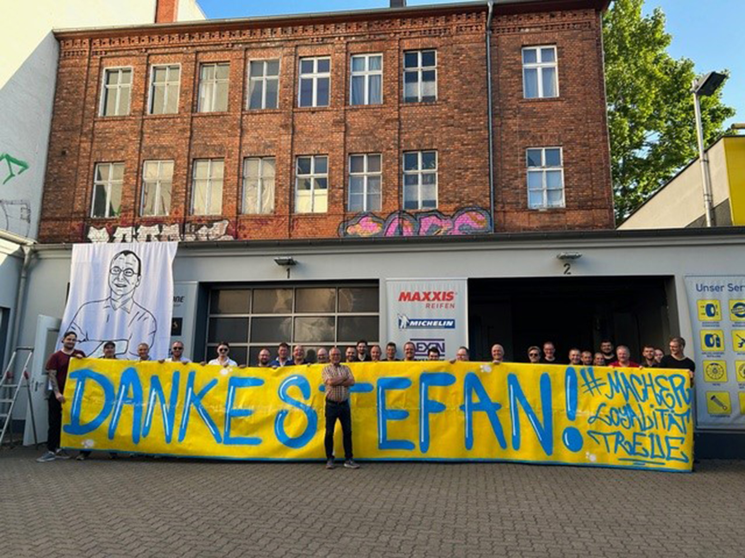 Zu der Feier zum Abschied wurde auch ein großer Banner mit „Danke Stefan!“ gefertigt (Bild: Reifen-Müller)