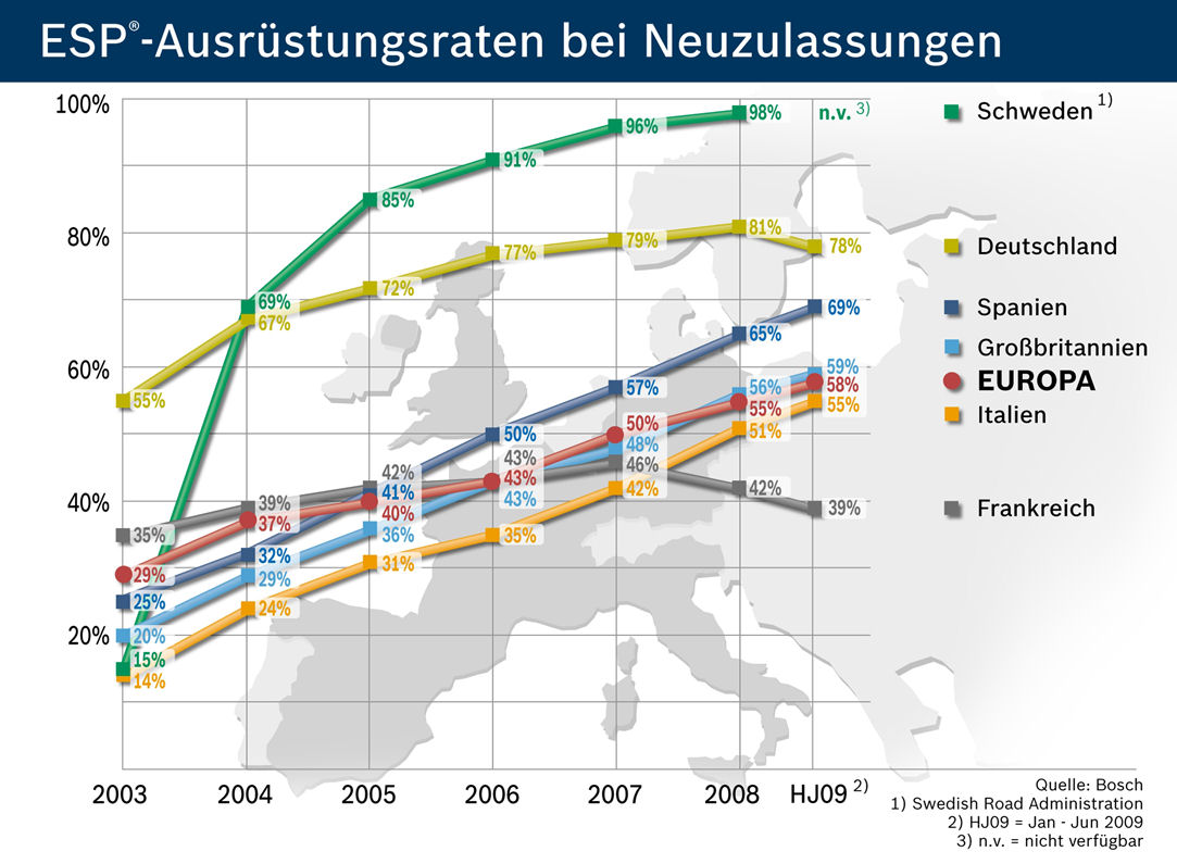 Erstmals gesunken ist der Anteil der in Deutschland neu zugelassenen Pkw mit dem Sicherheitssystem ESP. Wie nun Anbieter Bosch vorliegende Daten zeigen, sank der Wert im ersten Halbjahr 2009 auf 78 Prozent, das sind drei Prozentpunkte weniger als …