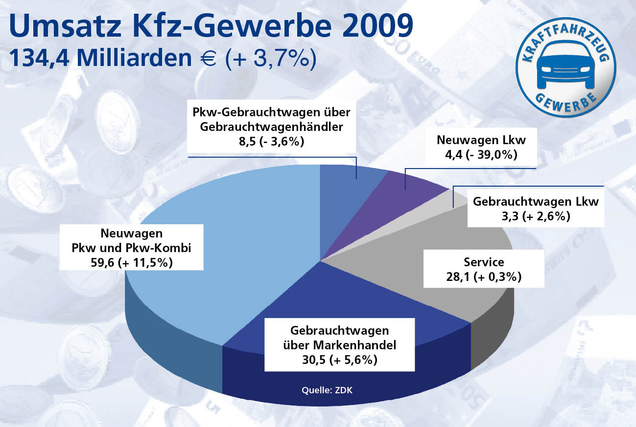 Die Sonderkonjunktur der „Umweltprämie“ hat dem Deutschen Kraftfahrzeuggewerbe in 2009 einen Umsatzanstieg von 3,7 Prozent auf 134,4 Milliarden Euro beschert. Der Zuwachs bei den Pkw-Neuzulassungen um mehr als 700.000 Einheiten gegenüber 2008 ließ die Umsätze im Neufahrzeughandel um …