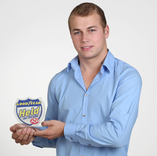 Ein 19 Jahre alter Mann brachte eine verunglückte Frau in Sicherheit, bevor ihr Auto in Flammen aufging. Dafür wurde er im Juli von Goodyear und dem Automobilclub von Deutschland (AvD) zum Held der Straße gekürt.